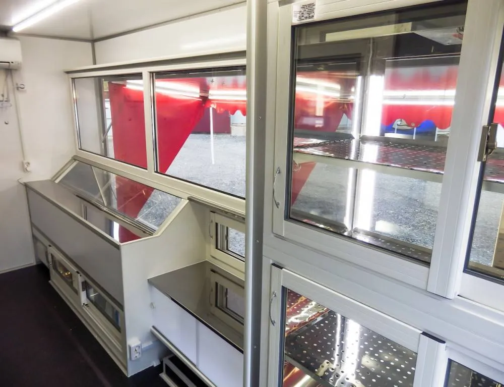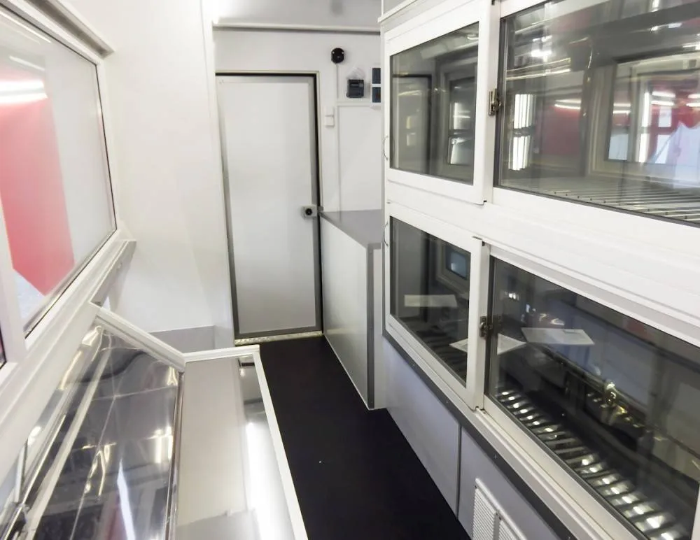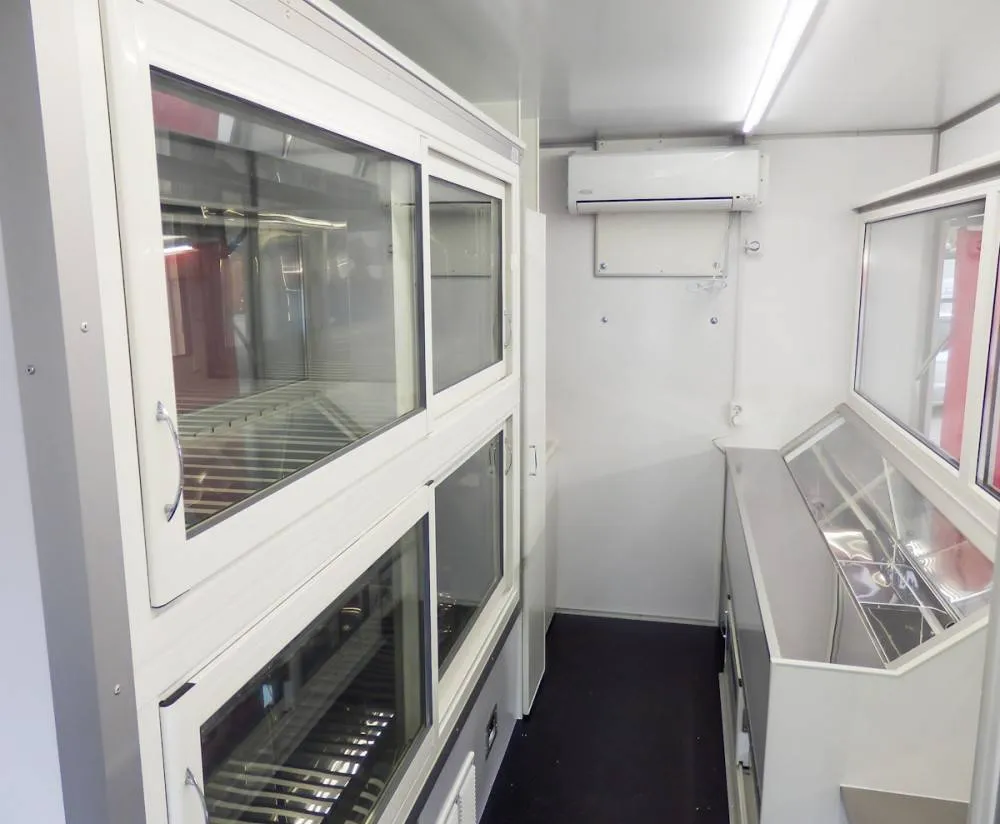 На автомобиле ДЖАК 56 имеются холодильные витрины, которые отличаются объёмом и расположением. Предусмотрены 2 холодильника по 800 литров каждый, мойка, 2 полки для весов и гардеробный шкаф. Автолавка оснащена автономной системой водоснабжения, блоком розеток. Стоит также отметить наличие комфортного внутреннего освещения. Отдельных слов заслуживают ПВХ-окна со стеклопакетами.